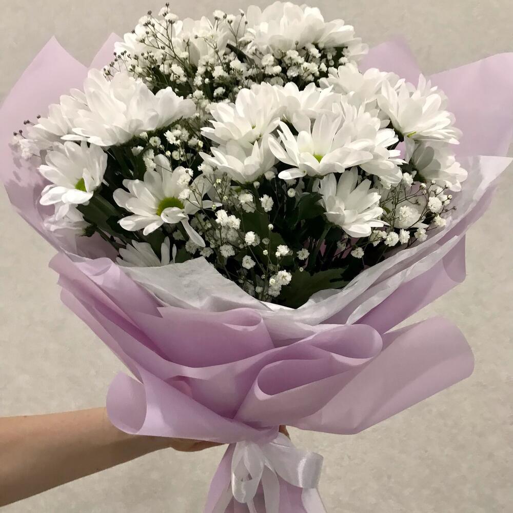 Букет из белых кустовых хризантем и воздушной гипсофилы – это стильный и нежный подарок, который подойдёт для любого случая. Воздушные веточки хризантем и гипсофилы создают ощущение объёма, а их стойкость позволит долго наслаждаться красотой букета.