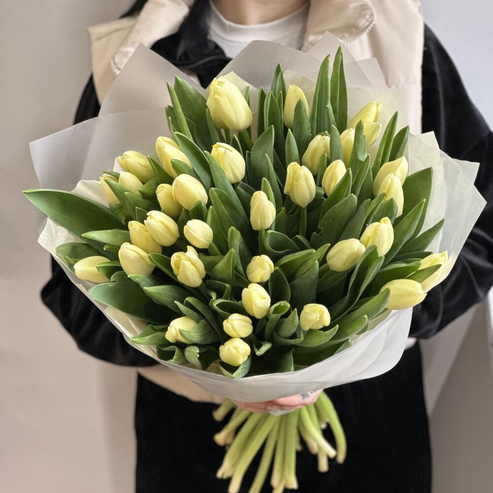 Прекрасный букет из лимонных Тюльпанов 35 штук. в нежной воздушной упаковке, прекрасной подарок на 8 марта день рождения, или даже без повода. Букет для жены, весенний букет, букет для мамы, букет для сестры, букет для подруги, букет для девушки